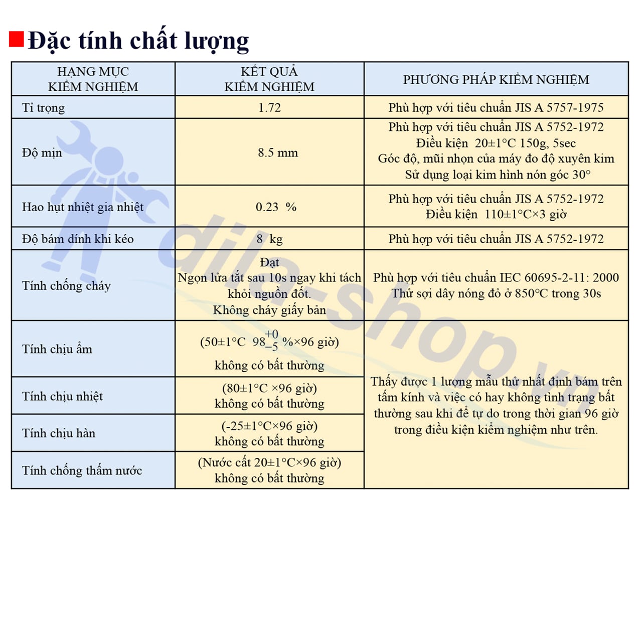 - Tỷ trọng sản phẩm: 1.72 – tiêu chuẩn: JIS A 5757 – 1975