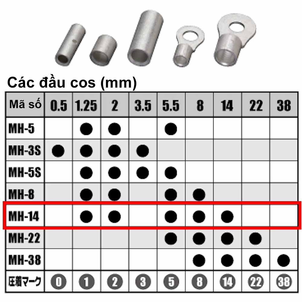 - Khả năng bấm chính xác: Kìm MH-14 được thiết kế để bấm chính xác đầu cos với lực ép mạnh, tạo nên mối nối chắc chắn và an toàn.