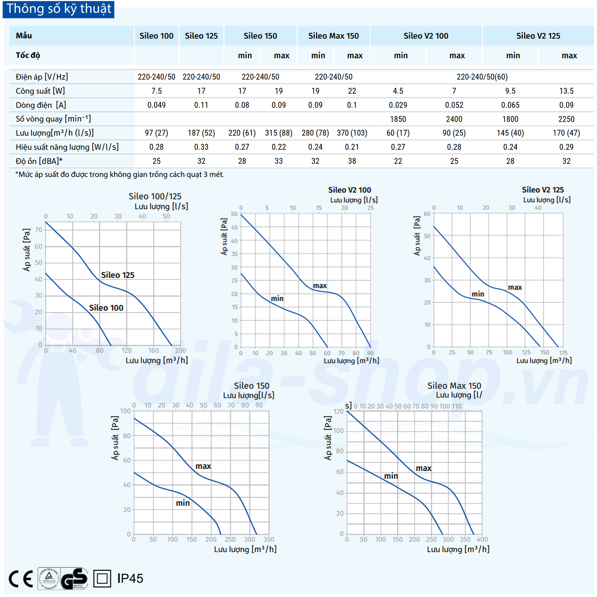 Quạt hướng trục Sileo được sử dụng để hút khí thải cho các cơ sở vừa và nhỏ. Quạt được trang bị van ngăn gió ngược ngăn không khí đi ngược vào phòng khi quạt tắt. Quạt còn được trang bị động cơ hai tốc độ. Quạt phù hợp kết nối với ống dẫn khí có đường kính Ø100mm, Ø125mm và Ø150mm.