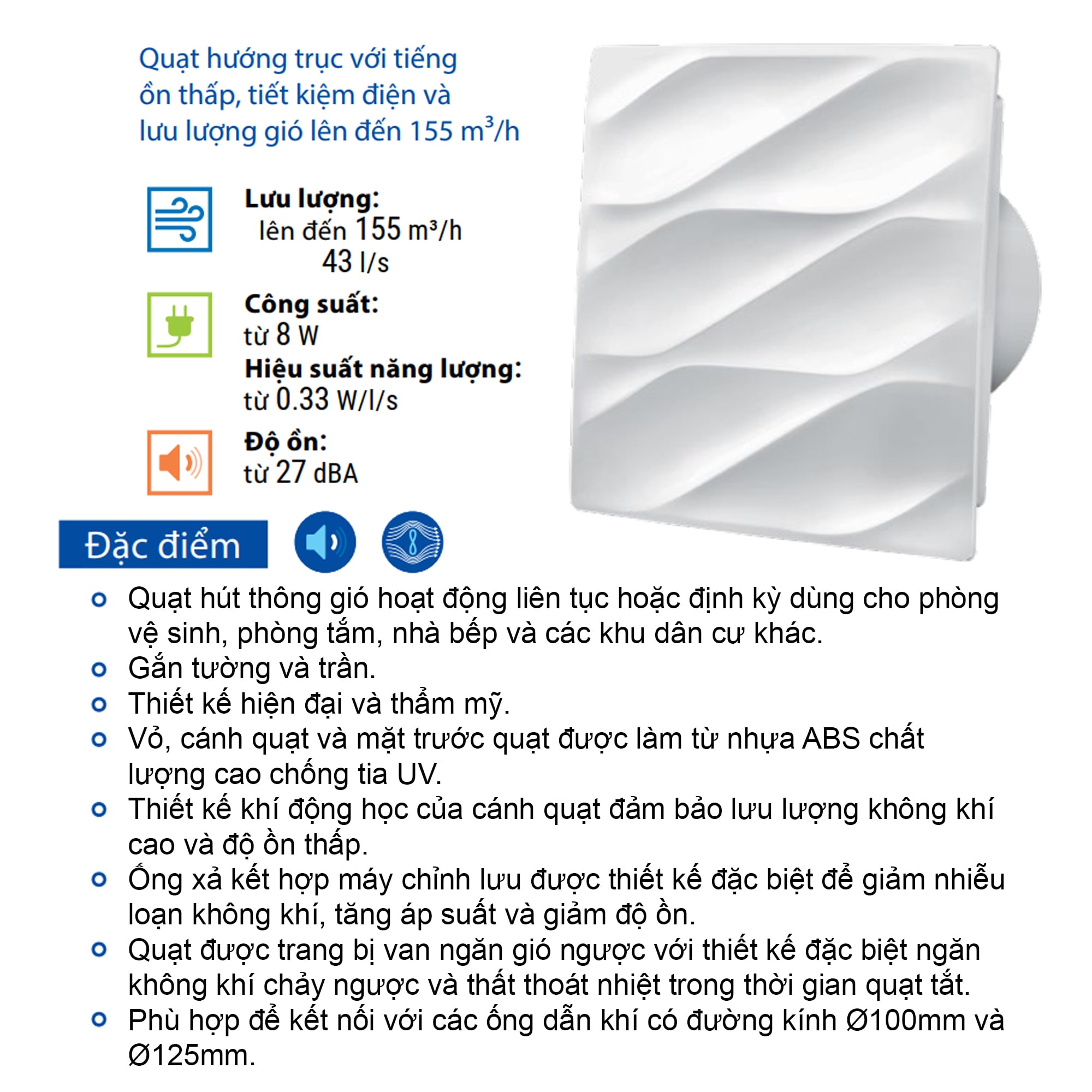 👉Tương thích với ống gió tròn có đường kính 100mm và 125mm.