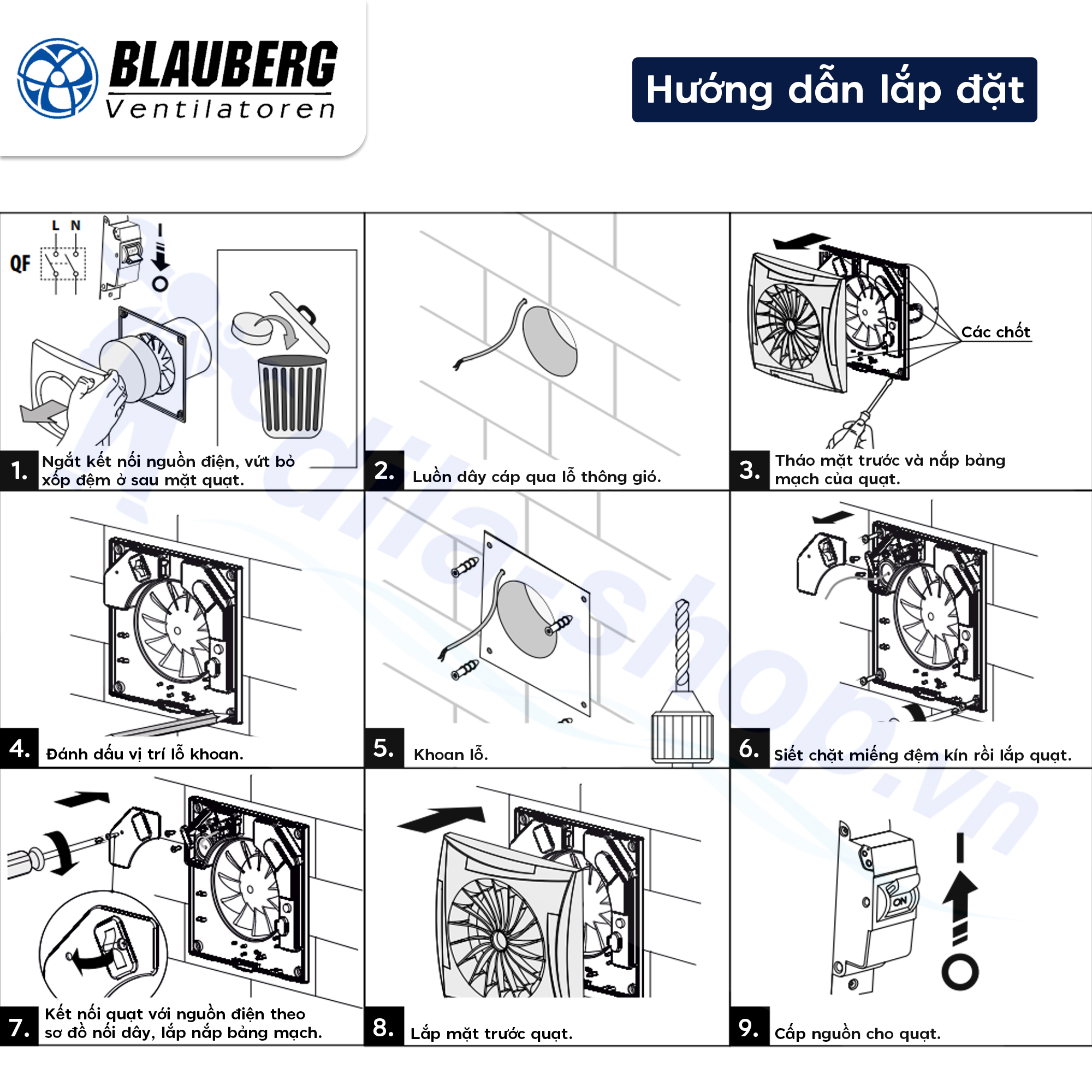 - Trước khi lắp đặt, kiểm tra cánh quạt, vỏ quạt và lưới có bất kỳ hư hỏng nào. Phần bên trong vỏ quạt không có vật lạ nào có thể làm hỏng cánh quạt.