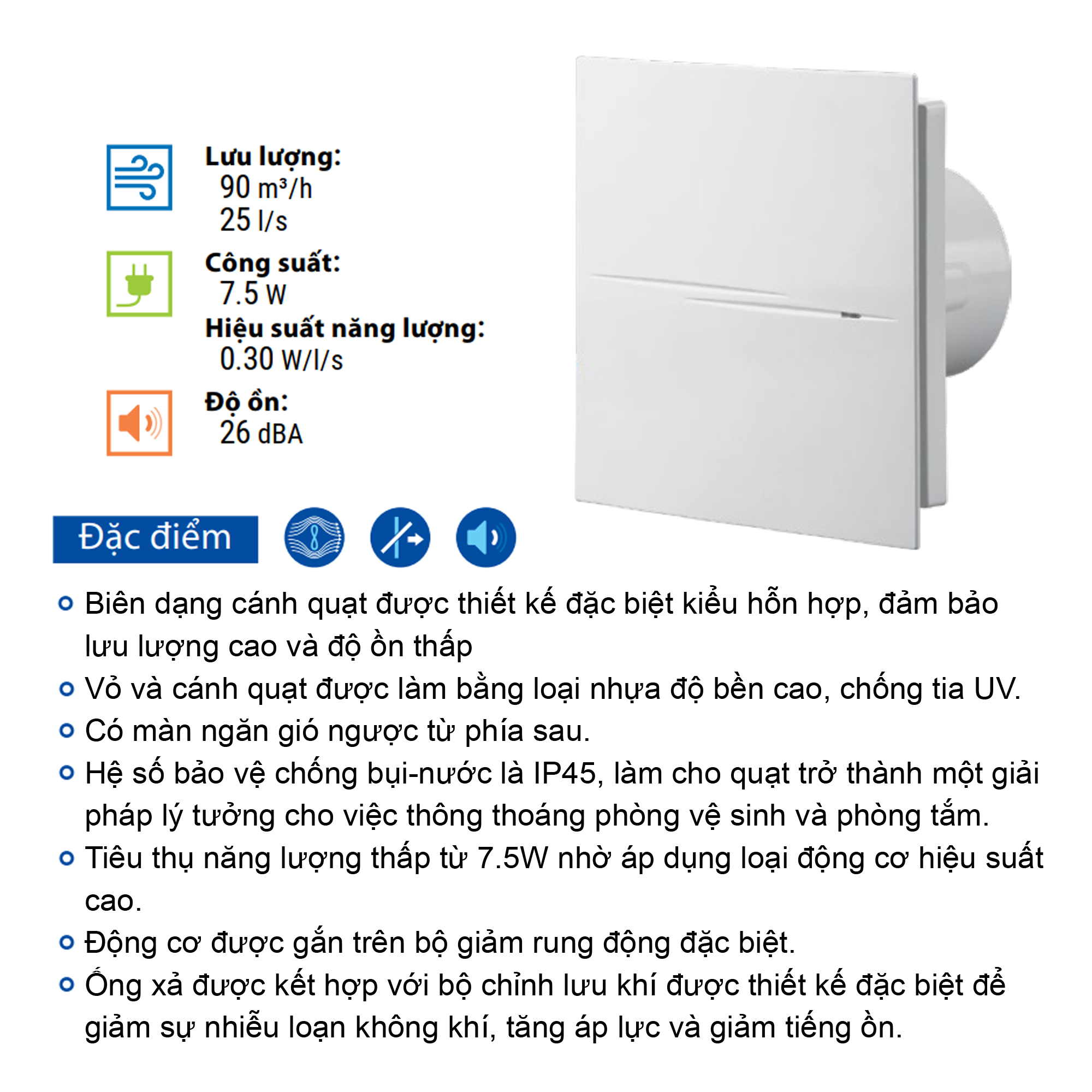 Quạt được thiết kế để lắp tường hoặc trần và có thể được sử dụng để xả khí trực tiếp ra ngoài qua ống dẫn khí tròn hoặc hệ thống ống dẫn, phù hợp để thông gió thải các khu dân cư. Quạt sử dụng động cơ bạc đạn, hoạt động liên tục không nghỉ, cánh quạt hoạt động êm ái, độ ồn thấp.