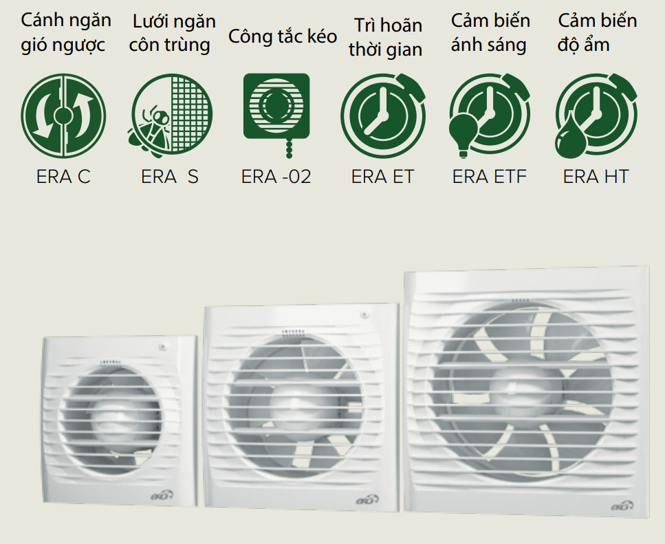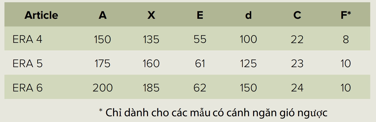 - ERA 4 và ERA 5 được trang bị với van chống gió ngước với cơ chế lò xo OK-line để bảo vệ cánh quạt (không bao gồm van