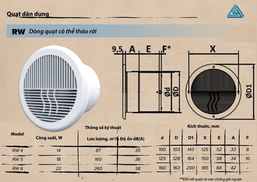 - RW dòng quạt có thể tháo rời.- Quạt có thể hoạt động hút khí thải hoặc cấp khí tươi trong hệ thống thông gió tuỳ theo lắp đặt.